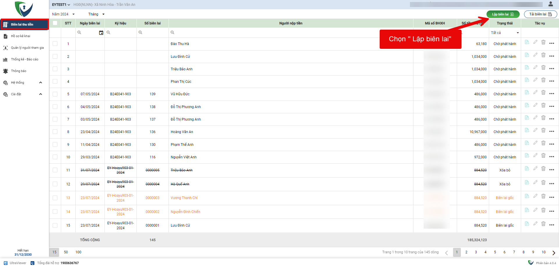 - Bước 1. Truy cập vào phân hệ Biên lai thu tiền, bấm vào nút Lập biên lai