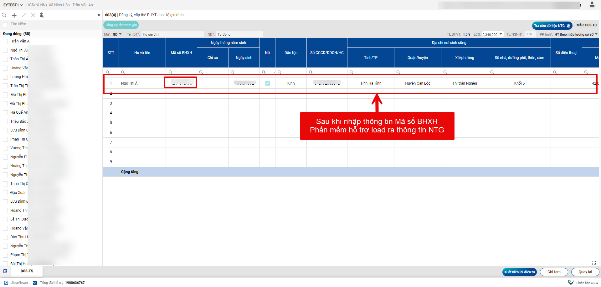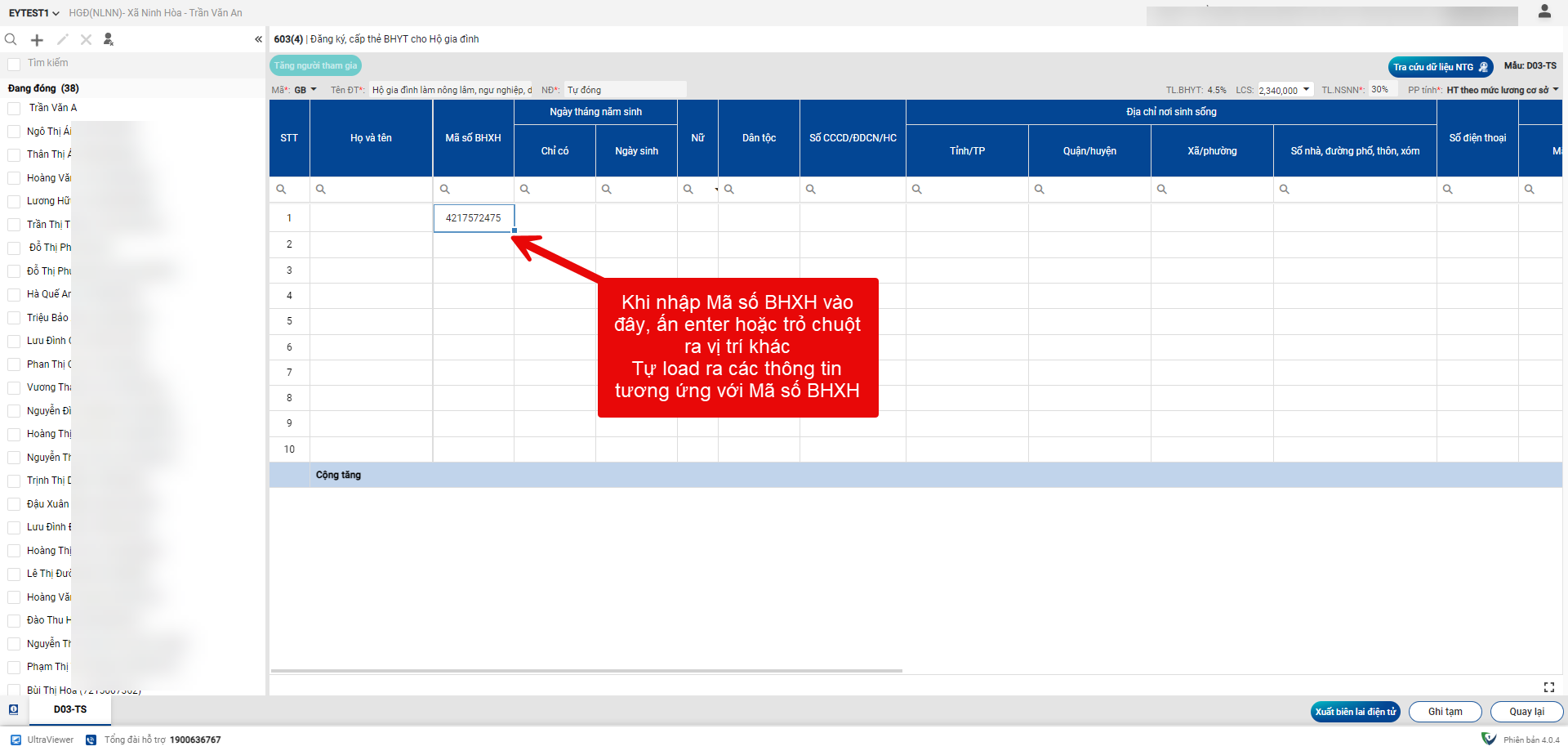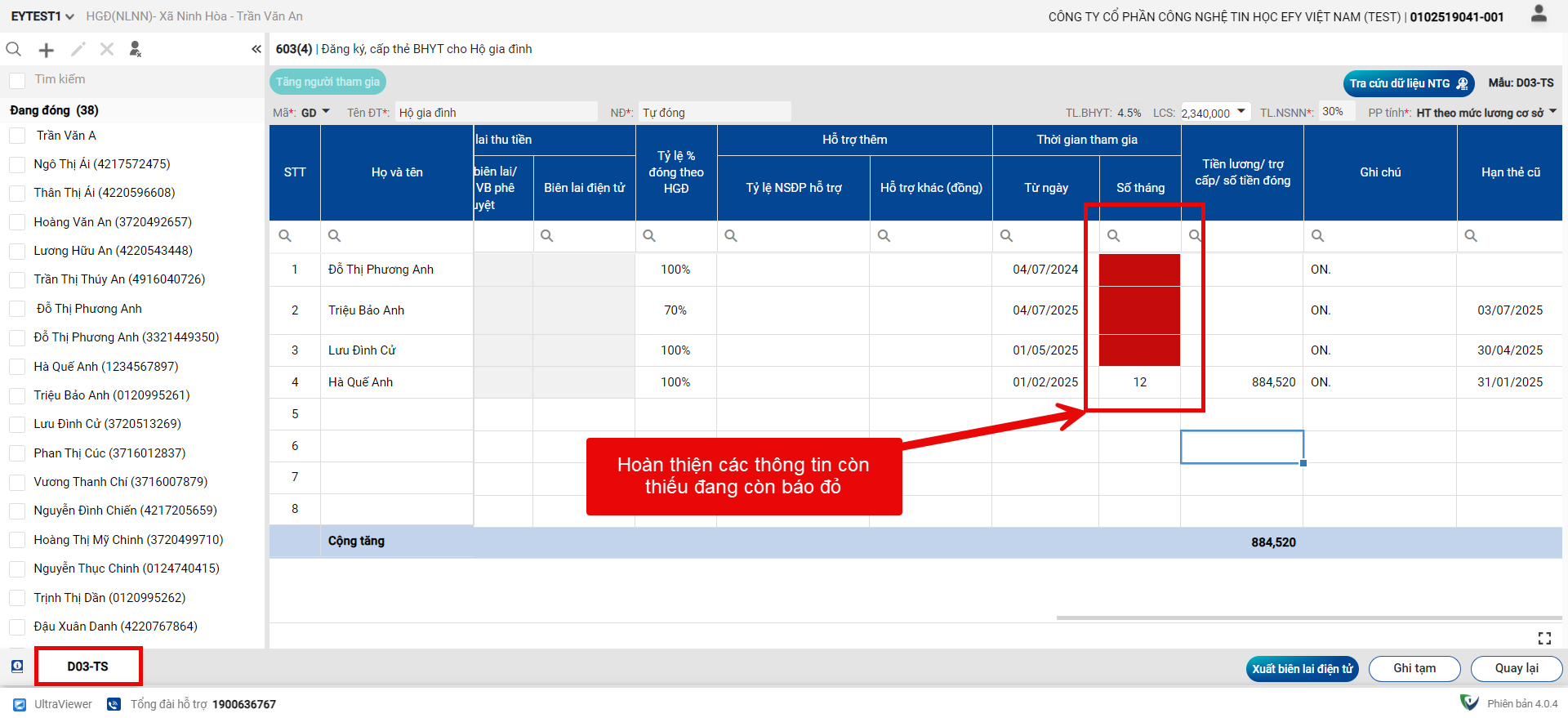 - Bước 4. Hoàn thiện các thông tin còn thiếu của người tham gia ở tất cả các tab trên lưới kê khai. Ví dụ: D03-TS, D05-TS,... (những thông tin báo đỏ là những thông tin còn thiếu và bắt buộc phải điền)