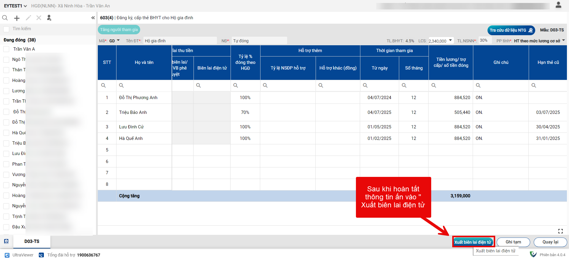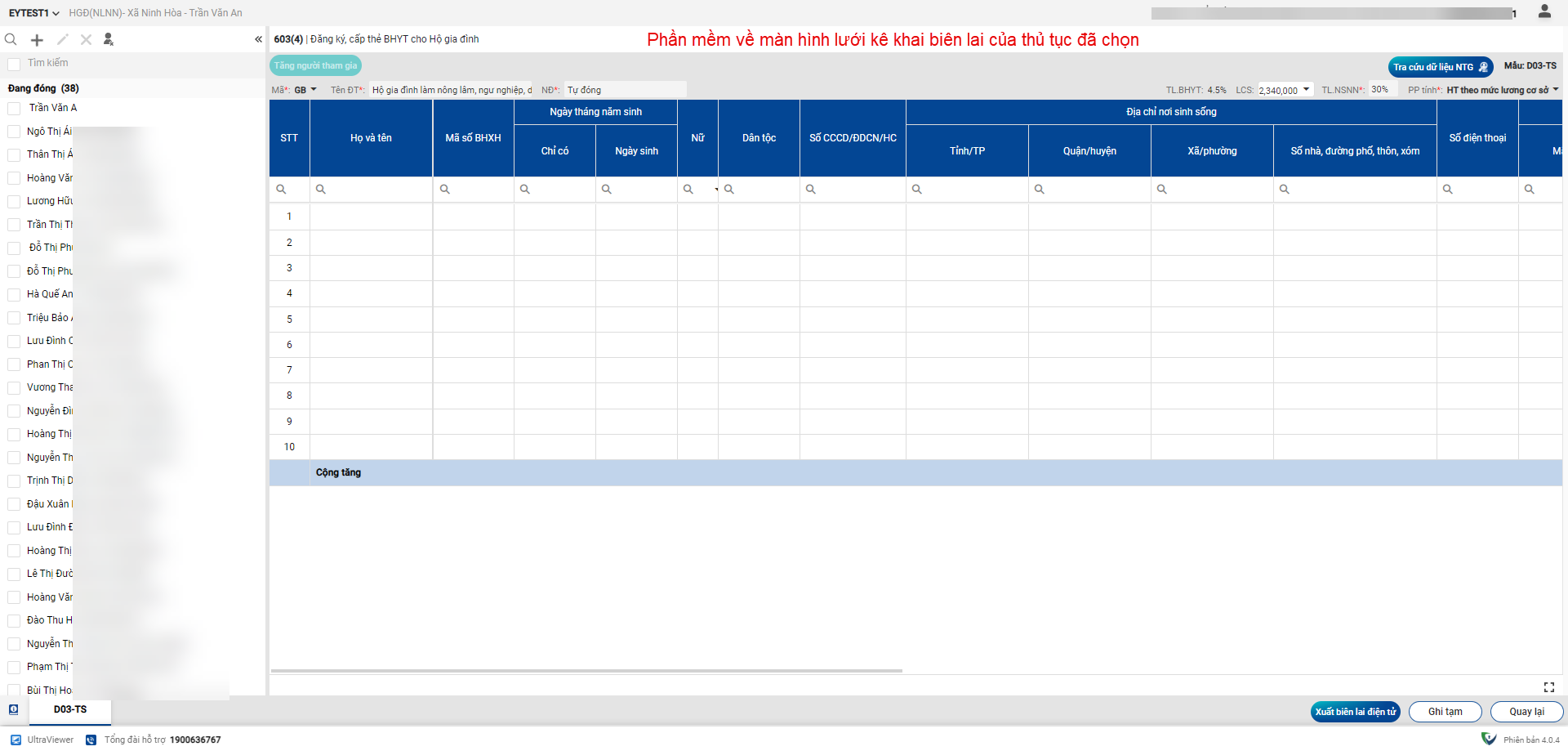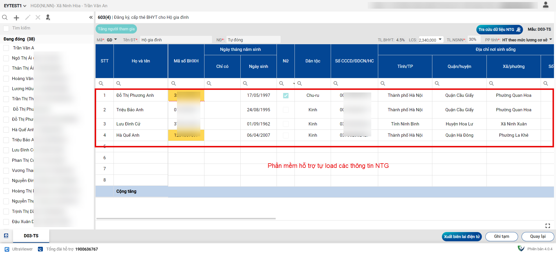 - Bước 4. Hoàn thiện các thông tin còn thiếu của người tham gia ở tất cả các tab trên lưới kê khai. Ví dụ: D03-TS, D05-TS,... (những thông tin báo đỏ là những thông tin còn thiếu và bắt buộc phải điền)
