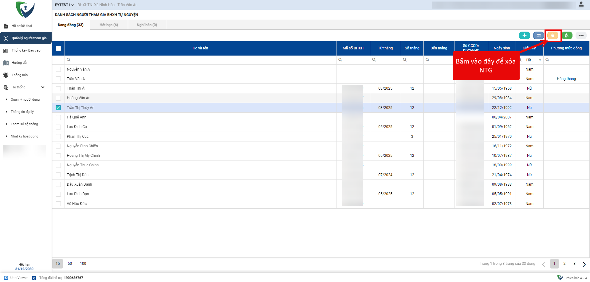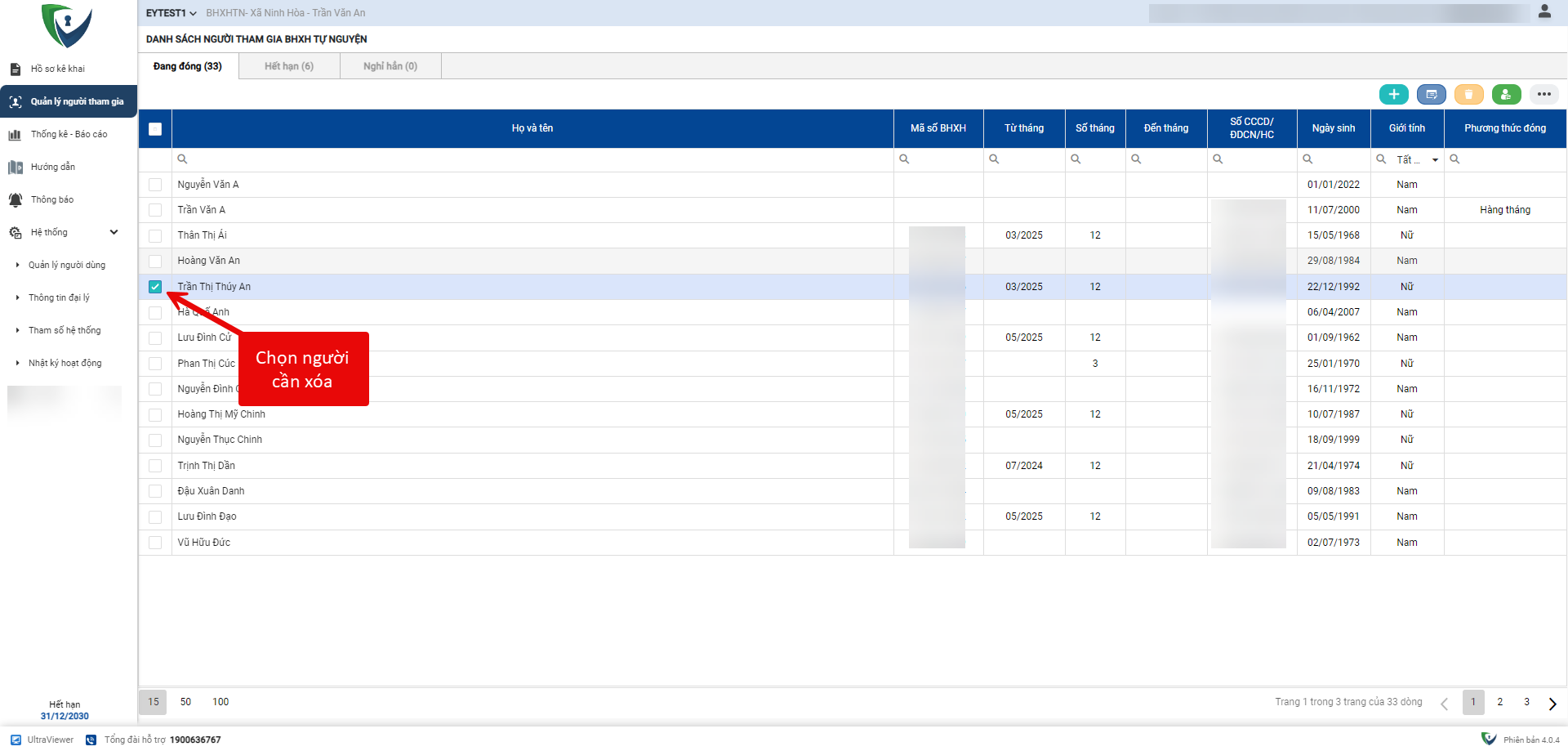 - Bước 1. Truy cập phân hệ Người Tham gia, tích chọn người tham gia muốn xóa thông tin