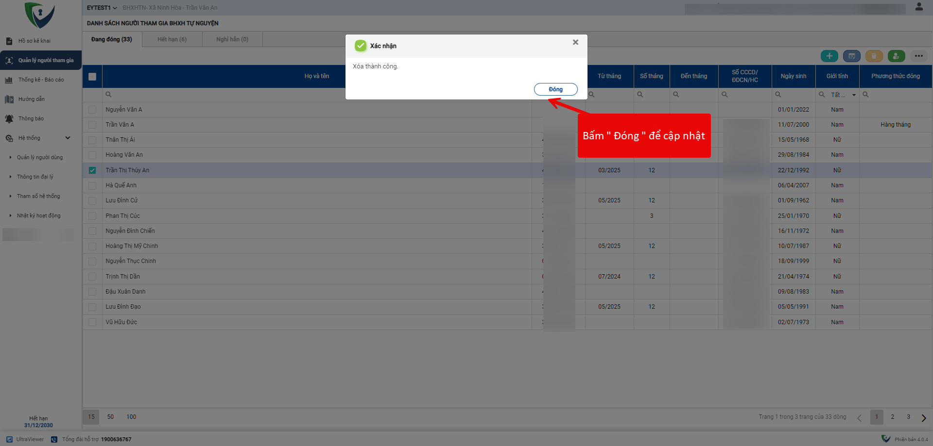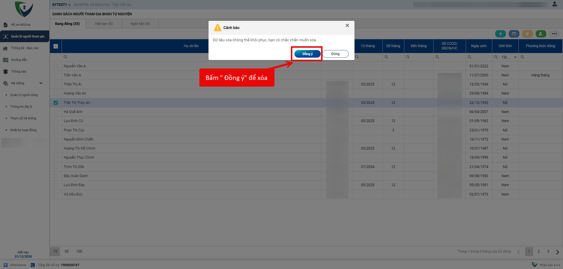 - Bước 3. Hiển thị Popup, Bấm Đồng ý để xóa thông tin người tham gia
